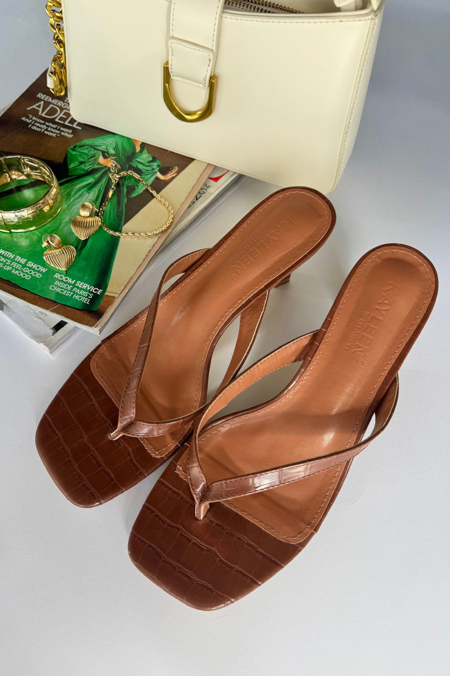 Thong strap kitten heelsEmbossed designSquare toeFits true to sizeHeel measures 2 1/2 inches