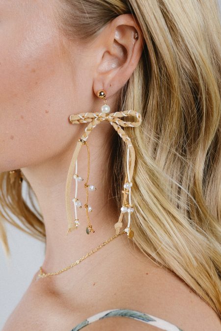 Details Gold plated bow post earringDangling chain with drop pearlAll earrings are considered final sale.Measures 1.5 inches All sale items are final sale.